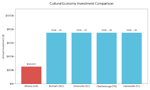 Cities like Durham (NC), Greeneville (SC), Chattanooga (TN) and Gainesville (FL) have made the investment. They are actively attracting the kind of cultural economy that Athens built first and now risks losing. This is a competitive landscape, and standing still is falling behind.